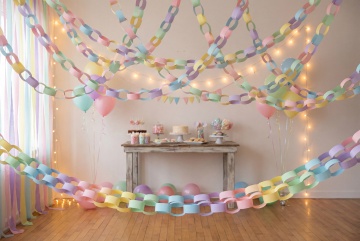 卡通手绘风格生日主题设计,白色纯色背景,上方悬挂彩色波浪形彩带和蓝色三角旗装饰,中央是立体效果的“HAPPY BIRTHDAY”字母,字母采用粉色、黄色、蓝色等明亮色彩填充,边缘有白色描边,下方散落彩色圆点、线条和闪电形状装饰元素,整体画面活泼欢快,色彩明快,充满童趣,图形元素排列错落有致,视觉层次清晰,符合生日庆祝的欢乐氛围。