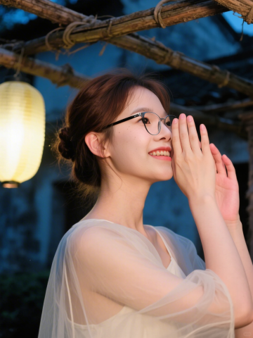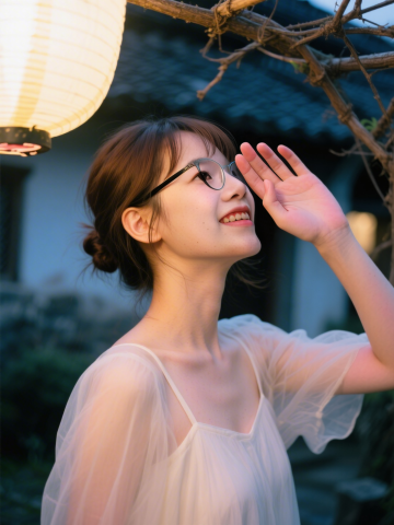 国潮风与水墨意境交融,柔光晕染下的清透纱衣与竹架灯笼相映,营造出唯美文艺的实景氛围,光影交错间尽显中式浪漫。