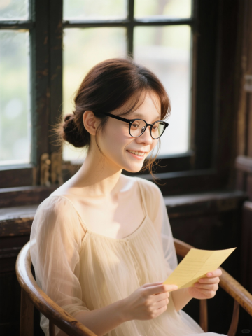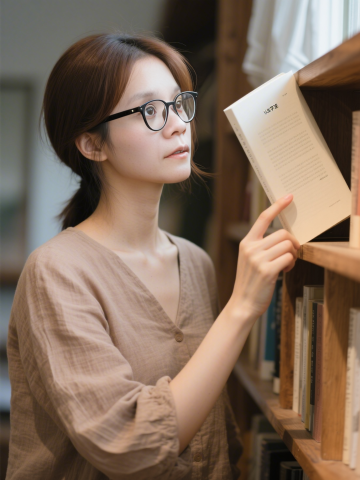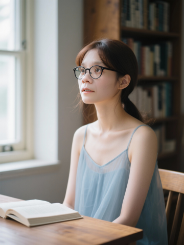 清新柔和的东亚风肖像,胶片质感光影晕染,文艺静谧氛围中透出优雅与舒适,书页轻启,时光静好。