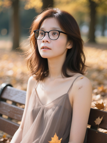 秋日暖阳下,女子静坐木质长椅,透明吊带裙随风轻扬,落叶点缀其间。自然光晕染柔和光影,微风拂发,尽显文艺与唯美之韵。