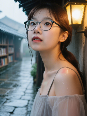 朦胧雨巷中,少女倚灯而立,水墨风与胶片感交织,光影柔美,东亚古韵弥漫,文艺清新,实景氛围沁人心脾。