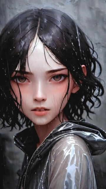 3D风虚拟现实肖像,重拟物塑料质感雨衣与湿发细节,光影交织营造静谧沉郁氛围,雨滴垂落强化情感张力。