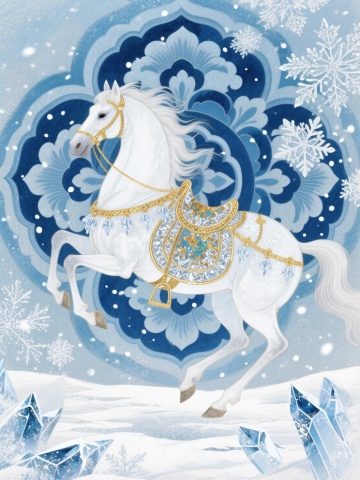 梦幻光影下的白骏马,融工笔风与国潮元素,鎏金刺绣点缀,极繁主义构图,尽显奢华唯美与古典优雅。