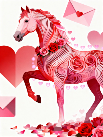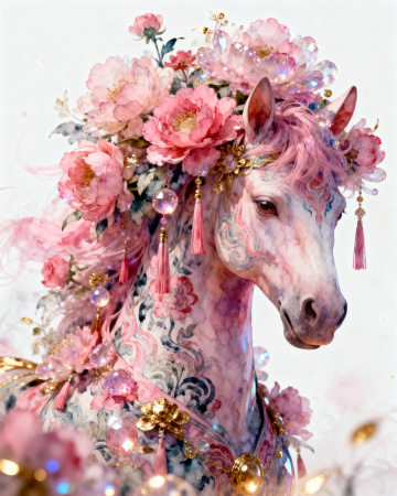 梦幻感与唯美交织,工笔风与水彩风融合,粉色花冠点缀晶莹珠饰,虚拟自然中的优雅马首,绽放浪漫甜蜜的东方诗意。