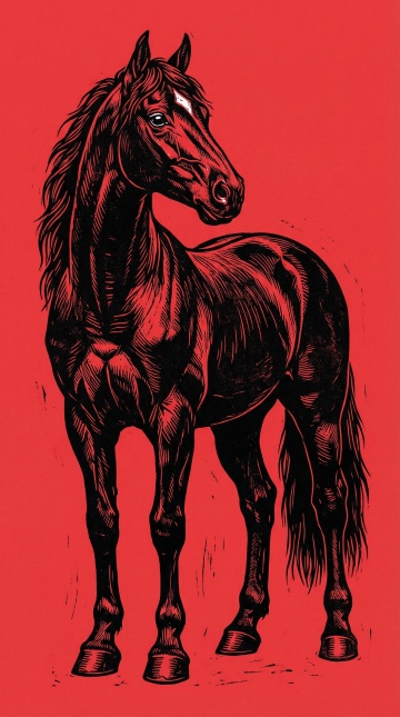 复古感与古典感交织,以双色设计呈现马的体积感,插画风结合版画与印刷质感,红色背景凸显力量与节日氛围。