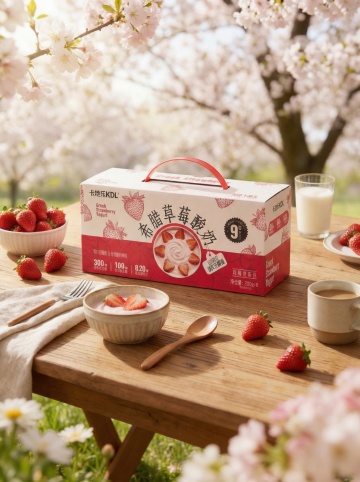 图示商品放置在浅木色餐桌上,周围搭配橙汁、牛角包、吐司、玻璃水壶。背景是浅米色墙面、置物架、透入暖光的窗户,装饰有绿植、花瓶等软装。