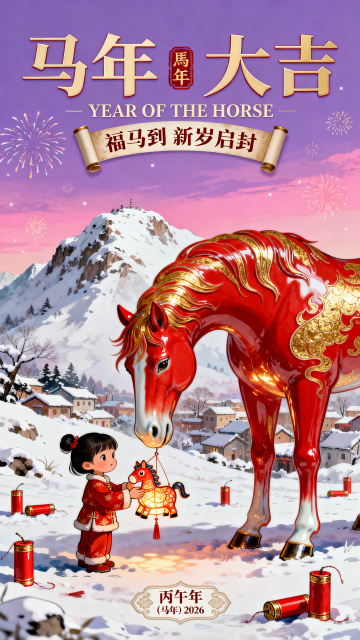 马年瓷板画,红马与童子共庆马年,鎏金文字与雪景交融,烟花绽放,喜庆梦幻。