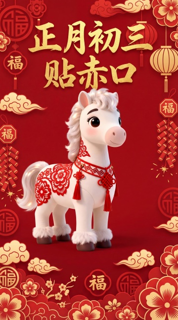 软3D风卡通马形象,国潮元素融合鎏金粒子效果,喜庆氛围浓厚,搭配烟花与祥云,传递2026丙午马年新年祝福。