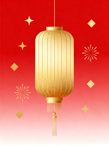 鎏金灯笼悬于渐变红背景,融合扁平与轻拟物设计,点缀星形与烟花元素,尽显中式喜庆氛围。