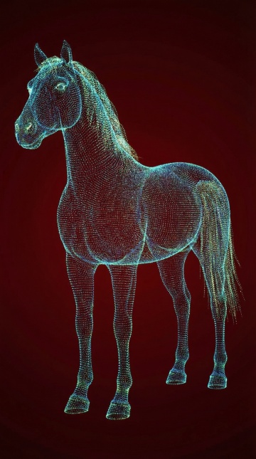 未来感与科技感交织的3D粒子马,以梦幻蓝光勾勒体积轮廓,呈现虚拟现实中的超现实主义美学。