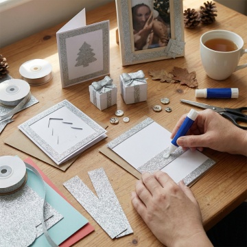 剪纸风与拼贴风结合的圣诞树,红绿金白层层叠叠,几何造型简约生动,金色星星点亮节日喜庆,温馨趣味跃然纸上。