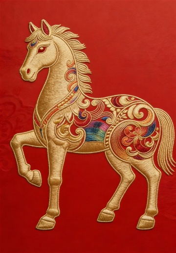 中式刺绣风格的金马,融合工笔细腻与重拟物造型,浮雕质感突出,红底衬托喜庆氛围,尽显民族韵味。