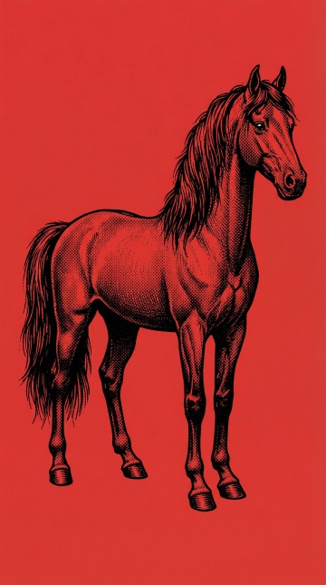 复古感与古典感交织,白描风线条勾勒出骏马的优雅轮廓,版画风格强化质感,插画风呈现文艺气息,红底衬托出节日喜庆氛围。