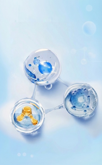 超写实主义风格,以清澈透明的水珠和气泡为核心视觉元素,画面中央是一个较大的透明气泡,内部含有复杂的、类似分子结构的透明水膜分隔,周围环绕着大小不一、悬浮的水珠和气泡,水珠表面光滑,折射出柔和的光线,带有细腻的高光和自然的阴影。整体色调以纯净的浅蓝色和白色为主,背景为渐变的浅蓝色,简洁干净,没有多余元素,营造出轻盈、通透、湿润、纯净的氛围。光线从上方柔和洒下,赋予水珠半透明的质感和微妙的光晕效果,气泡边缘有清晰的轮廓光,画面中点缀着细小的水珠飞溅效果,增强动感与层次感,整体构图突出水珠的晶莹剔透和空间悬浮感,保持精华主题,背景简单不抢主体。