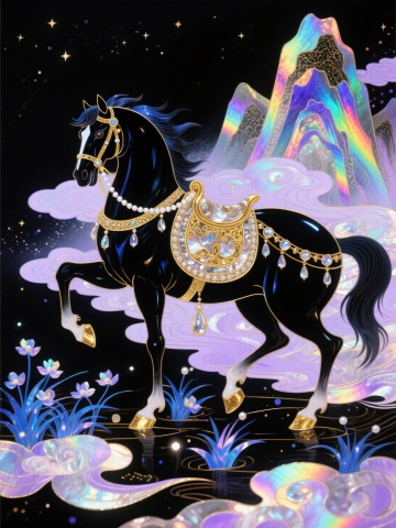 梦幻琉璃山峦映衬下,黑骏马身披鎏金华饰,踏云而行,国潮插画风融合玻璃质感与金属光泽,尽显奢华浪漫与神秘唯美感。