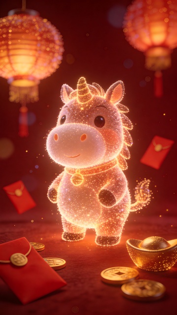 软3D风拟人小马,身着国潮红衣,手持灯笼,立于祥云之上,背景烟花绽放,喜庆卡通感十足,寓意2026马年大吉。