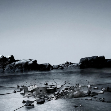 极简主义摄影风格,深色背景展台设计,展台主体为一块悬浮于平静水面的不规则深色岩石展台,岩石表面呈现自然的粗糙质感与细微纹理,展台在水面形成清晰对称的倒影,水面泛着柔和的蓝色光泽并带有轻微涟漪,背景是渐变的深灰色天空与朦胧的远山轮廓,整体色调以深灰、蓝灰为主,营造出宁静、沉稳、高级的氛围,光线柔和均匀,突出展台的立体感与材质感,画面构图简洁,留白充足,视觉焦点集中于中央的岩石展台,体现出自然、简约而富有力量感的设计美学。
