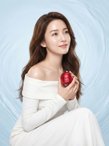 一张年轻女性手持护肤品、渐变紫色背景的美妆广告风格图片