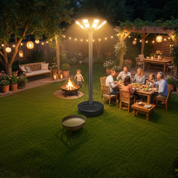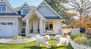 美式庭院场景,中央放置小宠围栏,围栏内几只兔子正在玩耍,背景是美式风格的建筑物并适当虚化,庭院中有草坪、花卉和休闲桌椅,阳光明媚,整体氛围温馨自然