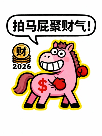 卡通拟人风格插画,粉红马戴拳套拍马屁,配“拍马屁聚财气”对话框,金币与2026元素呼应喜庆财气主题,描边风强化视觉趣味。