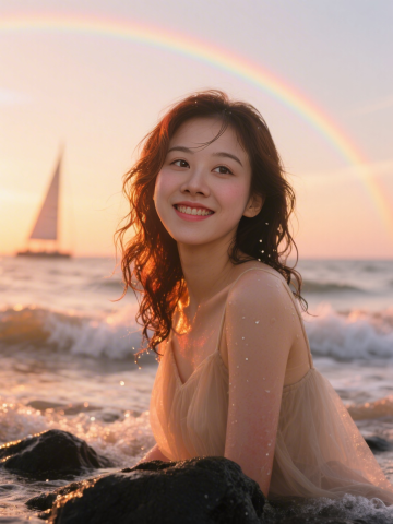 梦幻光影交织,水彩风晕染海天,彩虹与帆影共舞,温柔粒子轻拂发梢,唯美感与实景感交融,浪漫夏末邂逅。