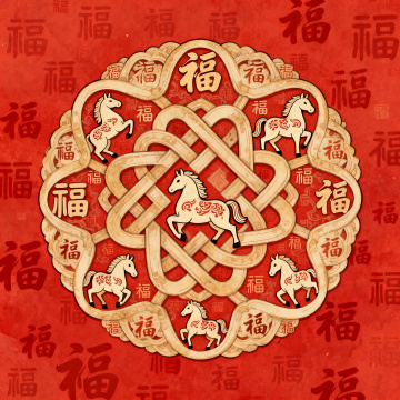 国潮风插画,融合工笔与刺绣质感,以古典盘长结为核心,环绕八骏奔腾,祥云花饰点缀,红底金纹尽显喜庆与民族韵味。