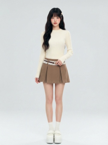 暖棕毛绒套装,融合时尚感与甜美感,搭配白色长袜与毛绒拖鞋,营造舒适慵懒风,现代简约室内场景衬托潮流氛围。