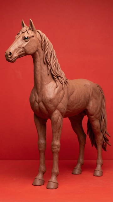 粘土质感的3D重拟物马雕塑,强体积感与细腻肌理,红色背景衬托出节日庆典氛围。