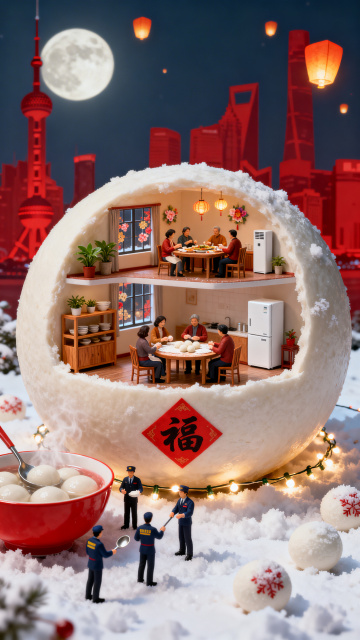 画面主视觉是巨型元宵造型的立体空间,元宵外壁贴 “福” 字,内部是两层温馨的家居场景(一层一家人围坐圆桌包元宵,装饰落地窗、木质置物架(摆绿植、餐具)、白色家电;、二层一家人在餐厅吃年夜饭),点缀着花灯,左侧搭配一个红色大碗装满一碗热气腾腾的元宵,一个物业维修员穿着制服,拿着大大的勺子,一个物业保洁员穿着制服抱着大大的元宵,一个物业保安员穿着制服给居民敬礼。底部环绕着暖光圣诞灯串。外部是雪地场景,