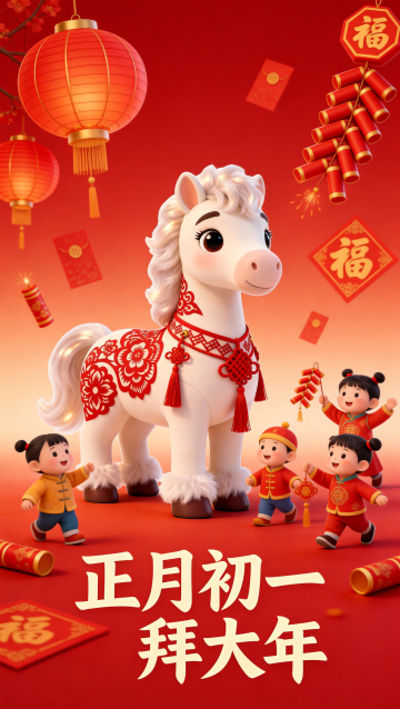 软3D风拟人小马,身着国潮红金唐装,手持灯笼立于祥云,夜市烟花映衬,喜庆卡通感十足,2026马年大吉。