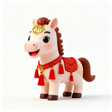 软3D风格的卡通小马,融合国潮元素,身披红色祥云纹饰,佩戴“福”字挂饰,喜庆可爱,传递新春祝福。