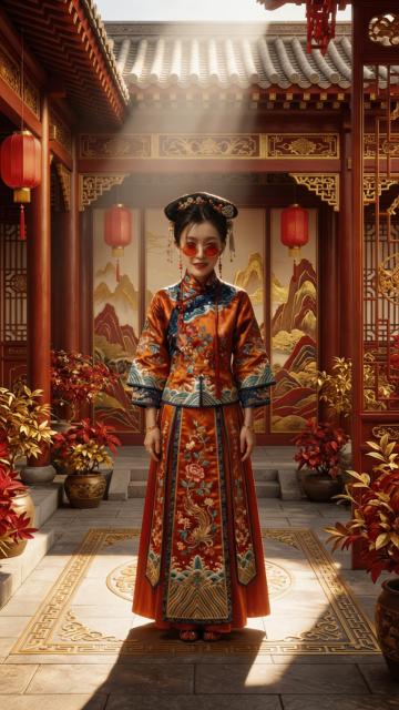 古典中式庭院中,身着刺绣华服的女子立于光影之间,工笔细腻,鎏金浮雕装饰尽显奢华优雅,红灯笼映衬喜庆氛围,传统与现代交融,展现东方美学之韵。