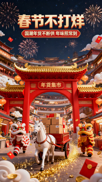 杰作,最佳质量,8k,超精细,高清细节,柔和暖光,3D 国潮卡通风格,马年年货节直播间,平视视角,完整构图,画面包含上贴片、双竖贴片、下贴片、场景化背景, 上贴片:位于画面顶部,红底金边圆形组合框内是白色文字 “年货提前囤”,下方是立体白色带红描边的超大主标题 “春节不打烊”,主标题下方为红色丝带式横幅,内有白色文字 “官方立减 限时 6.6 折”,右上角点缀 3D 卡通舞狮头元素,周围环绕金色烟