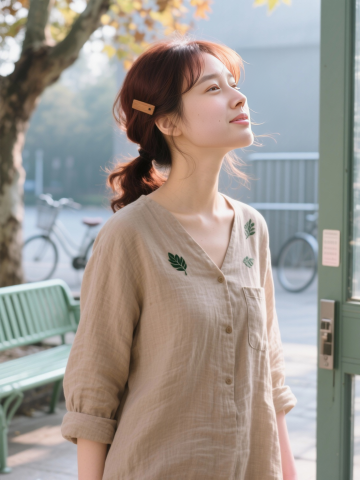 清新自然的文艺风,质朴面料搭配绿叶刺绣,柔和光影营造舒适实景感,木发夹点缀秋日静谧氛围。