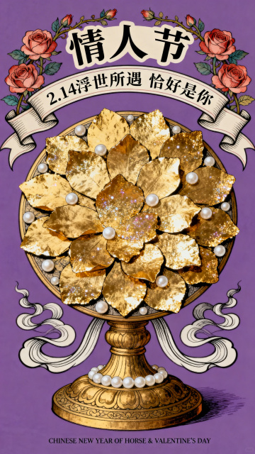鎏金风玫瑰绽放,工笔细腻勾勒,浮雕质感与中式祥纹交织,紫底衬托奢华浪漫,插画风呈现情人节的唯美优雅与复古情韵。