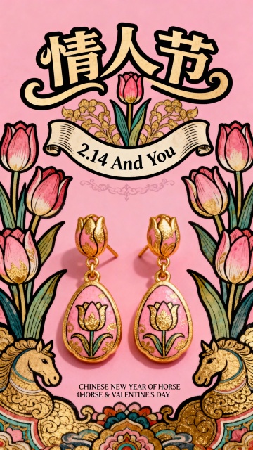 国潮插画风,拟人化双马相依,鎏金剪纸元素点缀桃花,喜庆甜蜜中透出可爱,呼应马年与情人节主题。