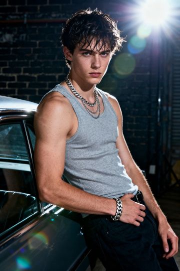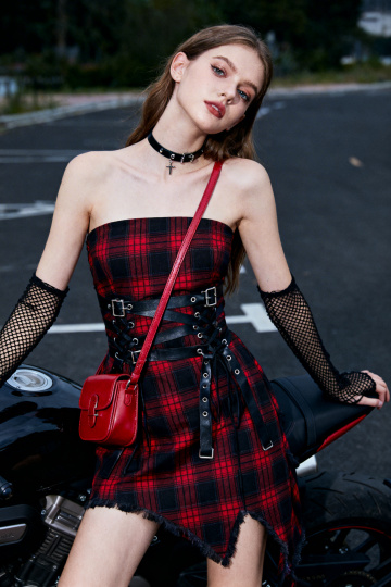 人物朝向右前方以放松且带有时尚感的姿态坐在粉色折叠椅上,椅子朝向正右方,右脚自然的踩在椅子边缘,右手臂自然的搭在膝盖上,左腿坐姿自然,左手拿着折起的晴雨伞悬于身前,整体姿态随性又有镜头感,既展现松弛感,又突出了手中的晴雨伞产品。