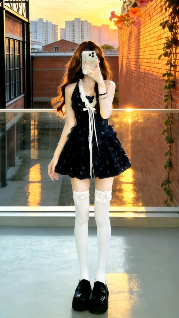 现代简约风格,黑色丝绒连衣裙搭配米色蝴蝶结与毛绒雪地靴,展现优雅时尚与温馨质感,实景拍摄突出面料细节与冬日氛围。