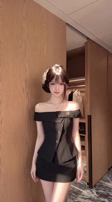 现代简约风,轻拟物设计,黑色连衣裙搭配毛绒靴,营造时尚优雅与舒适温馨的居家氛围。