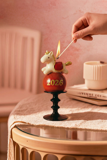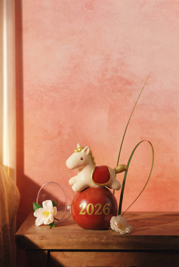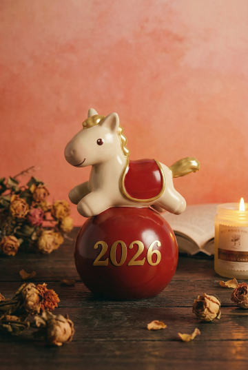 萌趣喜庆风设计,浅蓝陶瓷小马与红灯笼金箔等新年元素结合,营造红火欢乐的马年氛围