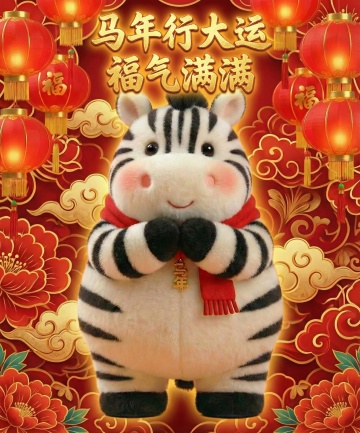 软3D风卡通斑马穿国潮唐装,拟人化设计,毛发生长细节精致,红金配色喜庆吉祥,搭配灯笼与祥云,营造2026春节鎏金国风氛围。