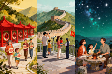 工笔细腻,刺绣质感,浮雕层次,插画风呈现中秋团圆场景,长城蜿蜒,明月高悬,花鸟点缀,中式复古温馨感满溢。