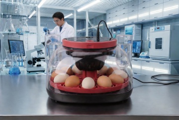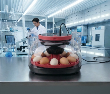 一张竹编托盘里装满浅棕色新鲜鸡蛋,其中一个鸡蛋已裂开露出橙黄色溏心蛋黄,托盘放置在深色木质桌面上,背景是阳光明媚的农家小院,院中有白色篱笆、盛开的黄色向日葵和几只悠闲踱步的芦花鸡,整体呈现超写实摄影风格,光线从斜上方照射形成清晰的明暗对比,突出鸡蛋的光滑质感和自然纹理,色调温暖和谐,充满浓郁的乡村生活气息。