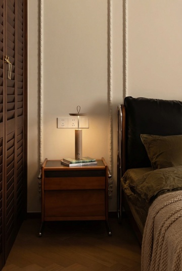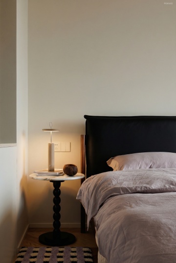 现代简约卧室,木雕风床头搭配柔和光影,性冷淡色调营造舒适温馨氛围,面料质感细腻,节日静谧感扑面而来。