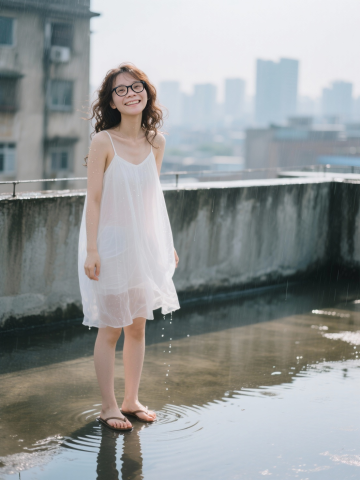 雨中屋顶,女孩身着白色连衣裙,水洼倒影映衬城市天际线,自然光洒落,光影柔和,清新文艺,都市与自然交融的唯美瞬间。