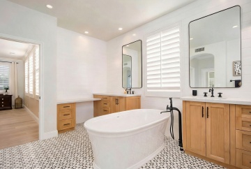 极简主义风格的卫生间室内设计,整体采用米白色与浅木色的柔和配色方案,温暖的嵌入式灯带与顶部筒灯提供均匀柔和的照明,营造明亮通透的氛围。墙面和地面铺设大块浅色哑光瓷砖,线条简洁流畅。不同场景下的卫生间摆设:有的配备悬挂式白色洗手台,台面整洁,搭配简约白色水龙头,上方是带储物功能的镜柜,旁边装有黑色金属毛巾架;有的设置独立玻璃淋浴房,内部有壁龛收纳洗浴用品,黑色淋浴喷头与五金件形成精致对比;有的墙面悬挂线条简约的黑白花卉装饰画,下方嵌入木质灯带壁龛,摆放香薰和装饰摆件;有的空间内放置智能马桶,旁边设有带木质搁板的收纳区。整体设计注重功能性与美学的平衡,空间布局合理,细节处理精致,呈现出现代、干净、舒适的卫生间环境。