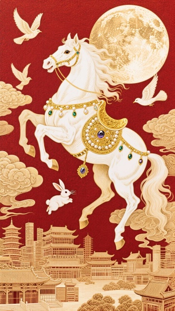 鎏金浮雕骏马跃动于红金祥云间,融合国潮风与古典纹样,金属质感尽显奢华喜庆,传递中式节日祝福。