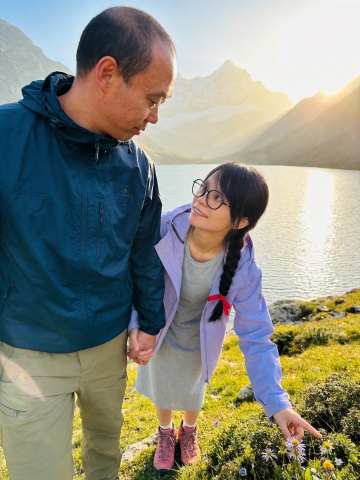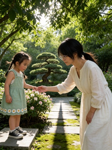 清新柔和的东亚园林实景,母女牵手轻触花丛,水墨与水彩交融的轻拟物风格,营造出舒适静谧的春日氛围。