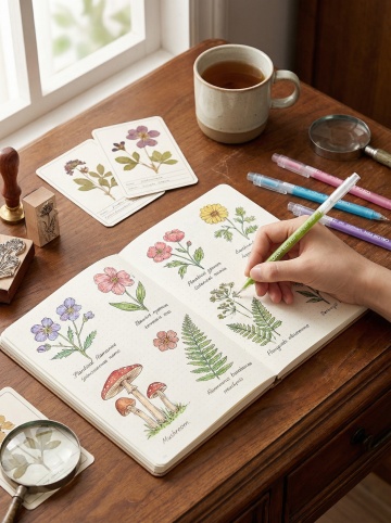 自然光从窗户斜射而入,在浅色墙壁上投下清晰的窗格阴影,营造出明亮通透、宁静舒适的居家办公氛围。一张原木色桌面的书桌,桌面光滑有自然木纹,桌腿为白色简约设计。桌上放置着不同场景和布置:左侧可能是一盆茂盛的绿色观叶植物,右侧是一台打开的银色笔记本电脑,电脑旁叠放着几本不同厚度的书籍,书籍上点缀着一盆小型多肉植物在白色花盆中;或者桌面上是一盏简约设计的台灯,旁边散落着几本翻开的笔记本和一支金属钢笔,桌角可能还有一个小巧的相框或一个复古风格的时钟;又或者是桌面上整齐排列着绘画工具,几支不同型号的画笔插在陶瓷笔筒中,旁边放着打开的颜料盒和一张铺展开的素描纸,角落点缀着一杯热气腾腾的咖啡杯。整体画面采用写实主义风格,色彩以原木色、白色、绿色为主,光影对比柔和,细节丰富,展现出现代简约而不失温馨的不同书桌场景布置。