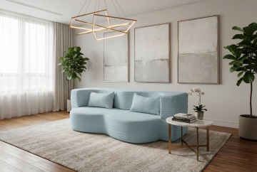 低角度仰拍,极简主义客厅被深邃的靛蓝色黄昏笼罩,磨砂玻璃移门过滤出靛青与紫罗兰交织的暮色,原L形沙发现为深炭灰色丝绒材质,两个不规则几何黄铜边靠垫在暗光中泛着冷金属光泽,相连的茶几变为悬浮式黑色大理石台面,下方垂挂着三盏微型玻璃钟乳石吊灯。浅灰色地毯升级为带有细微银色几何图案的羊毛材质,人字形木地板在阴影中呈现深棕与乌木色的渐变。沙发背景墙变为哑光黑色,中央悬挂着一幅悬浮式LED光影装置,金色线条随时间缓慢流动变幻形态。右侧角落的绿植现为一株大型琴叶榕,栽于六边形哑光黑水泥花盆中,叶片边缘在暮色中泛着蓝绿色荧光。天花板中央是一个直径两米的圆形智能调光装置,此刻正投射出类似月食的渐变光晕,空间整体呈现出一种冷静克制的未来感,却依然保留着家的温度与静谧。